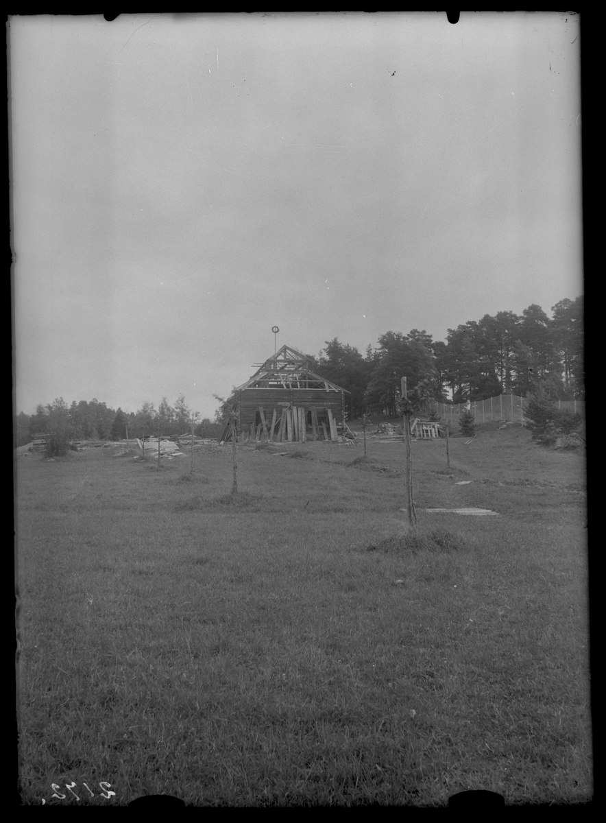 Herrgården i Svedvi, Hallstahammar under uppförande på Vallby Friluftsmuseum. Taklagskransen.