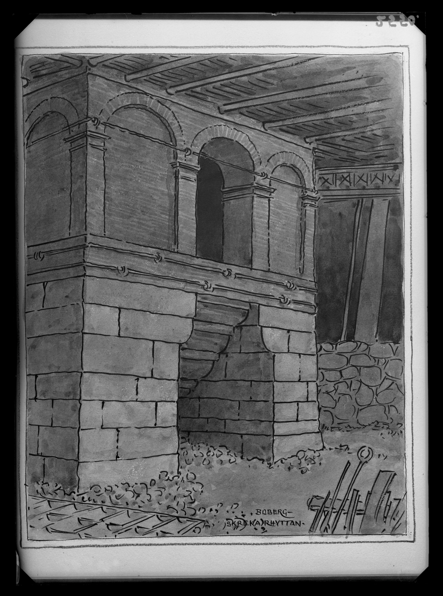 Akvarell av Ferdinand Boberg. Stället i masugnen, Skrekarhyttan.