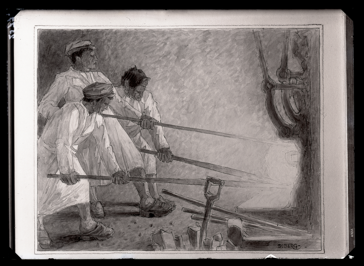 Akvarell av Ferdinand Boberg. Smältsmeder dra ut smältan ur härden.