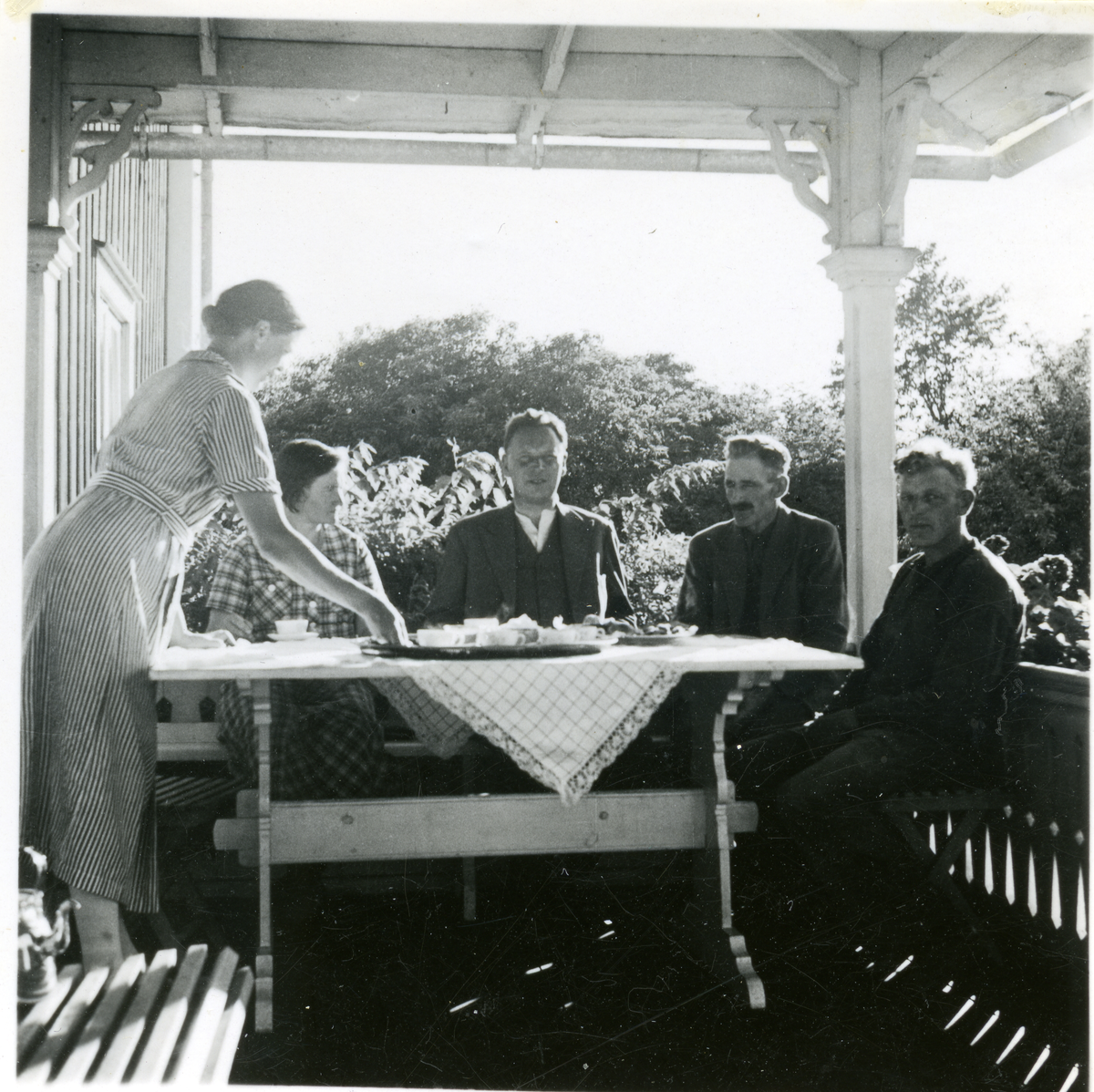 Kyrkoherde A. Eriksson bjuder på kaffe vid gammelgårdens ordnande, 1937.