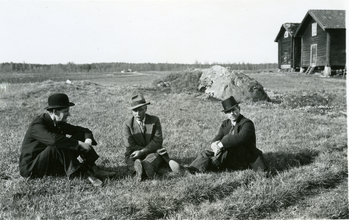 Tre män sitter i gräset framför lador. 1930-tal.