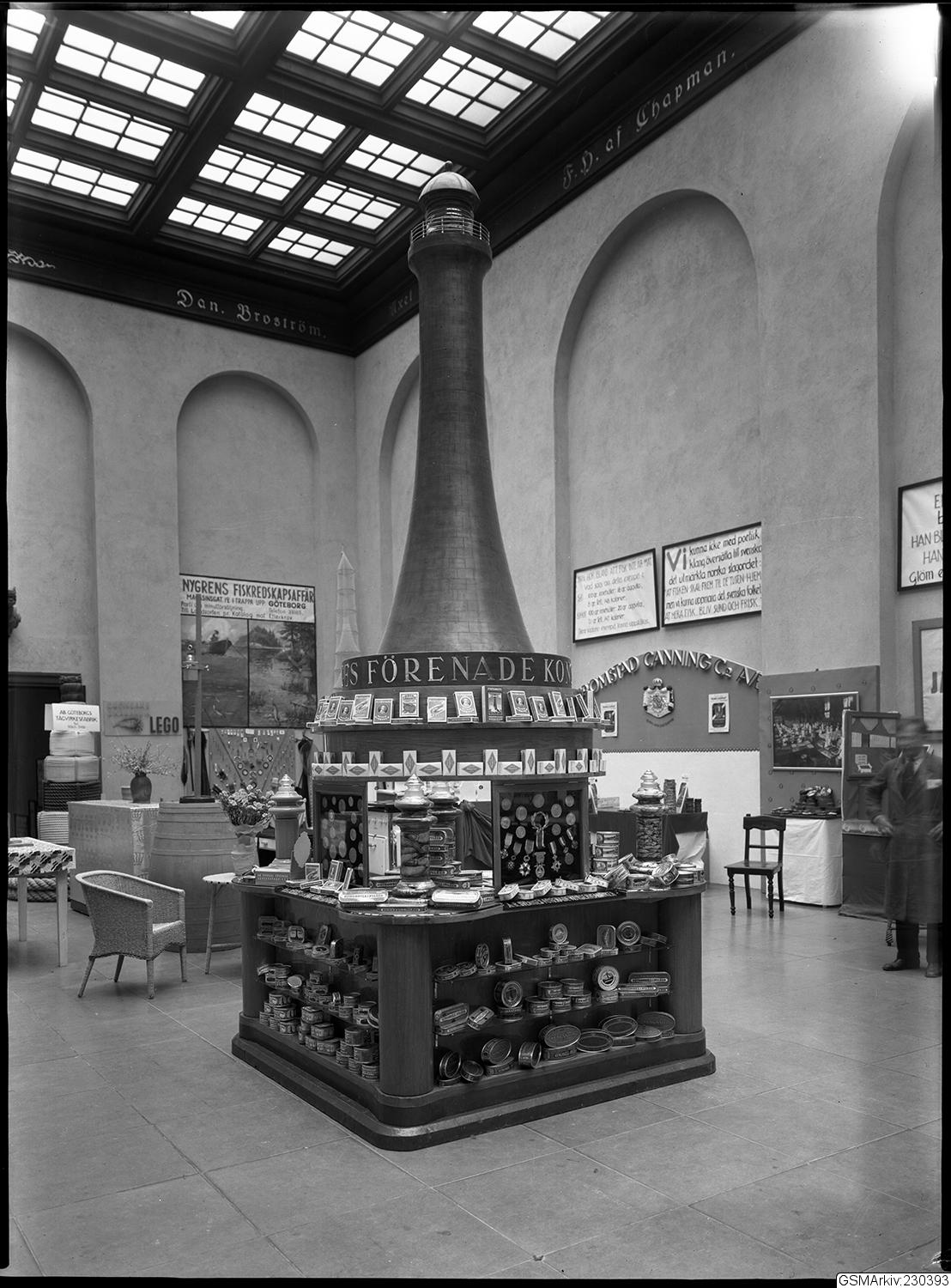 Svenska mässan utställare, Aktiebolaget Sveriges förenade konservfabriker. Fyren i montern symbol för Fyrtornets Fiskbullar