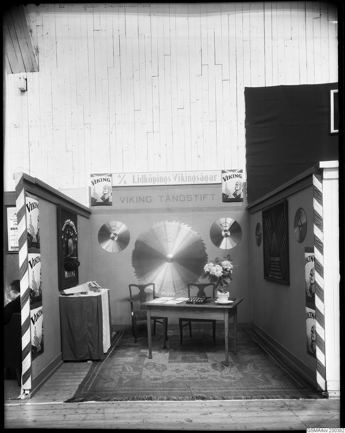 Monter på Svenska Mässan, utställare AB Lidköpings Vikingsågar. Företaget tillverkade också tändstift.