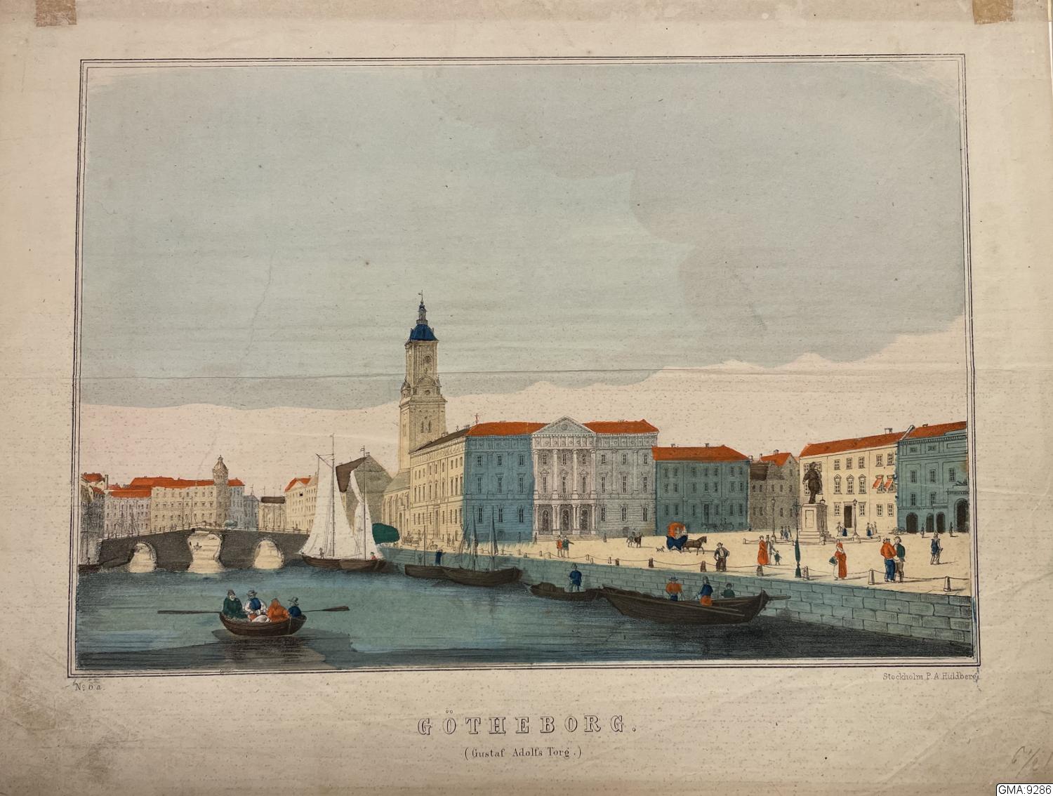 kistebrev, färgtryck: "Götheborg (Gustav Adolfs torg). Stockholm, P.A. Huldberg No 6a.".