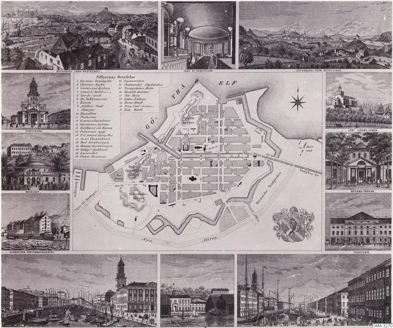 "Plan och panorama över Götheborg". Litografier av Carl Otto efter teckning av Johan Leonard Björkfelt. Plankarta och vyer från Göteborg vid mitten av 1800-talet. - Lorentska porterbryggeriet, numera Carnegieska bruket, uppfördes 1813; Karl Johans kyrka var färdig 1826; Nya Varvet anlades 1700, förändrades 1870 till fångvårdsanstalt. Brunnsinrättningen i Brunnsparken anlades 1834, ändrades till badhus 1858 och nedrevs 1870; Manégen vid Östra Larmgatan anlades 1824, numera Aug. Abrahamsons & Co. fastighet, nedrevs 1874. Garnisonssjukhuset i hörnet av Södra Liden och Kungsgatan. Lasarett invid Chalmerska slöjdskolan vid Norra Larmgatan. Navigationsskolan vid nuvarande Hvitfeltsplatsen uppförd 1842, flyttad 1862. Handelsinstitutet inrymt sedan 1826 i hörnhuset vid Kronhus- och Östra Hamngatan flyttades 1882. Simskolan låg där bron vid Lilla Bommen för över till Hisingen.