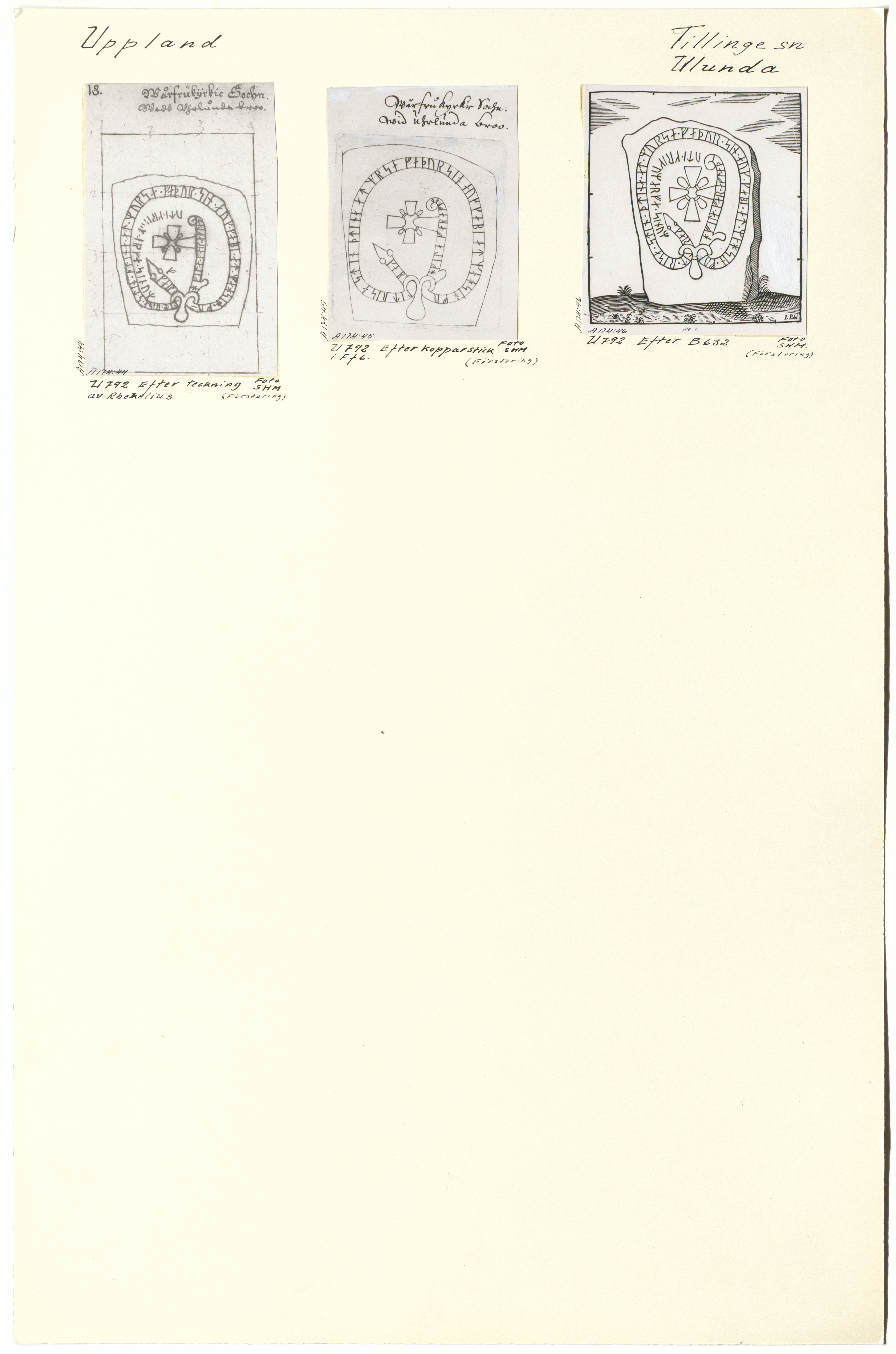 Beskrivning: Bild 1: U 792. Upphov: Jonas Rhezelius (Okänt år). Bildtext: Efter teckning av Rhezelius (Förstoring). || Bild 2: U 792. Upphov: Johannes Bureus (Okänt år). Bildtext: Efter kopparstick i Ff 6 (Förstoring). || Bild 3: U 792. Upphov: Johan Peringskiöld (Okänt år). Bildtext: Efter B 632.