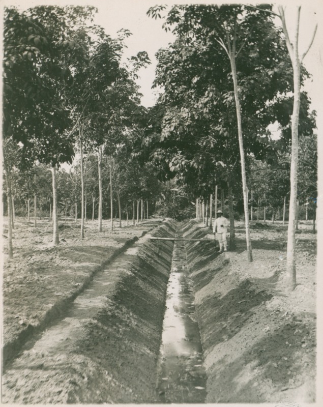 Svartvitt fotografi av gummiplantage, troligen på Sumatra.