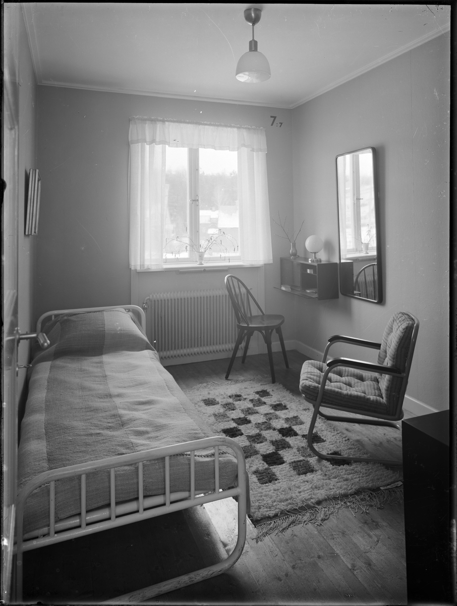 Sovrum med säng, fåtölj och stol, toalettbord och spegel.