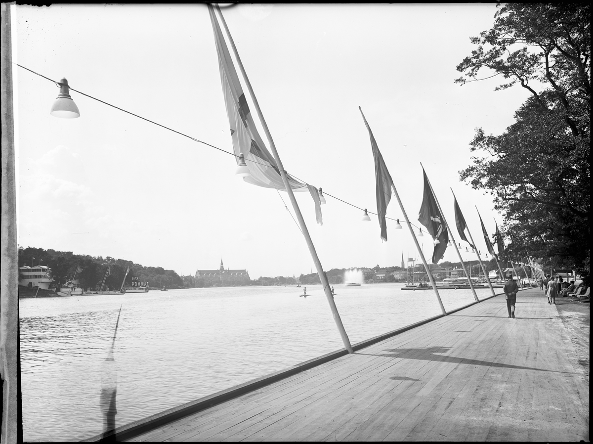 Titel: Stockholmsutställningen 1930 Strandpromenad med flaggor. Vy över vatten med Nordiska museet i fonden.