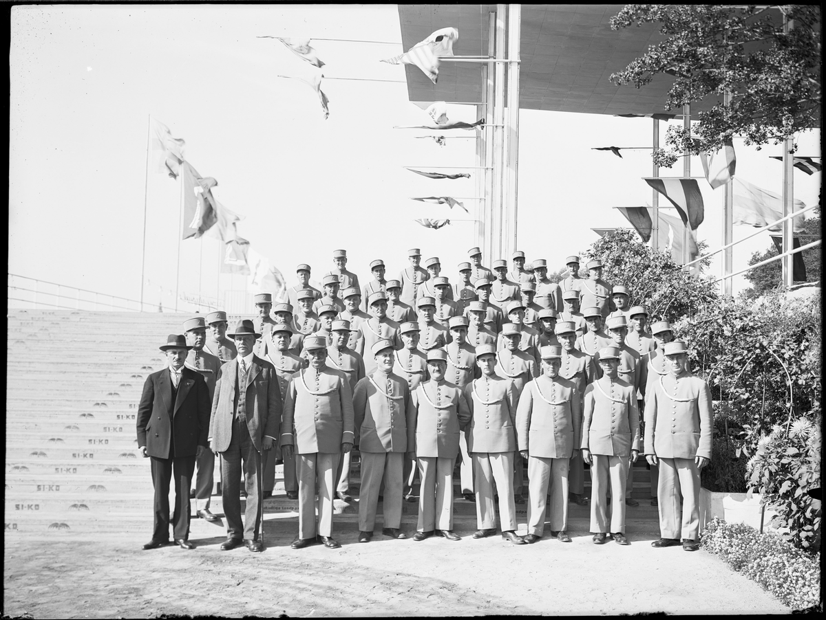 Titel: Stockholmsutställningen 1930 Gruppbild. Manlig vaktpersonal i ljusa uniformer.
