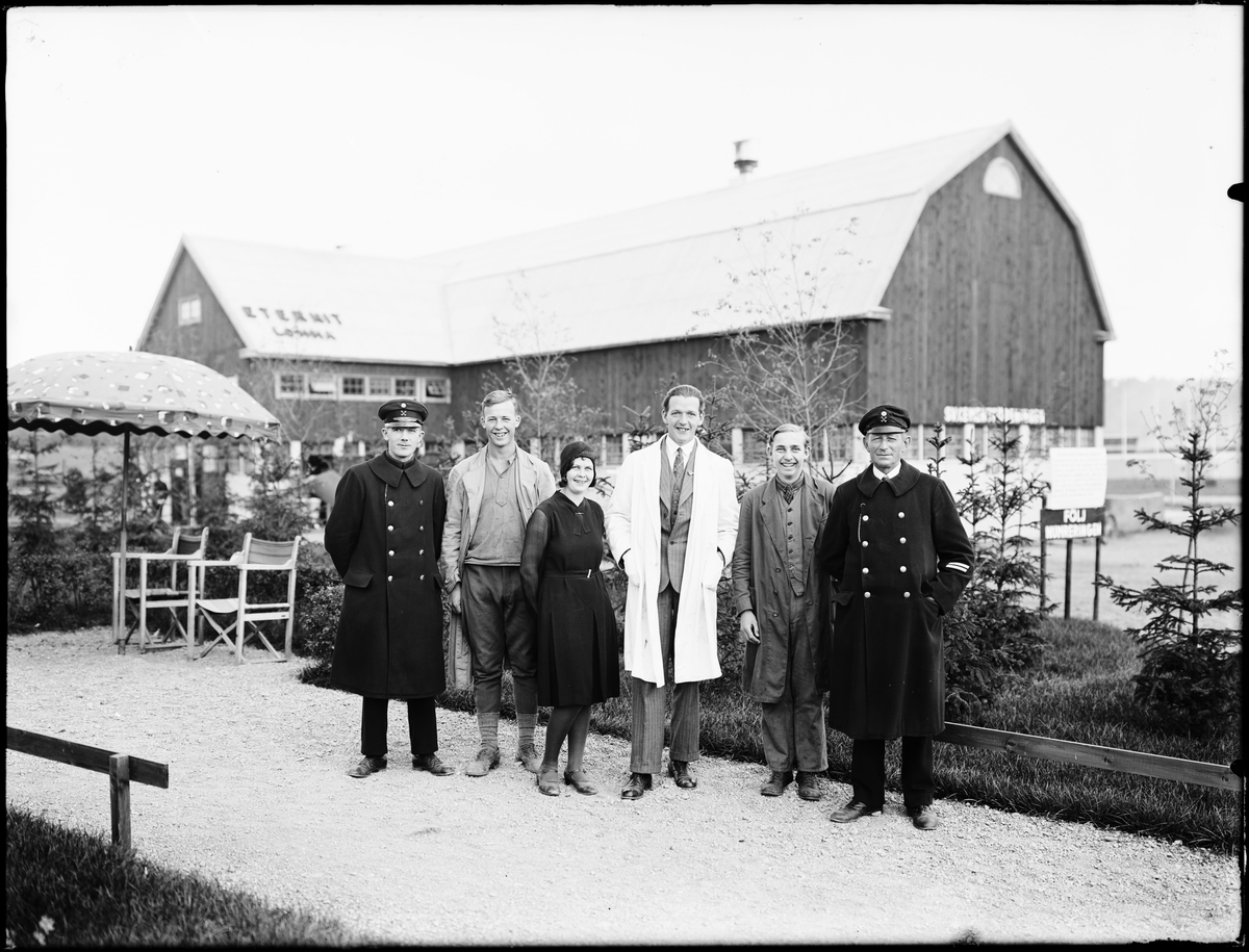 Titel: Stockholmsutställningen 1930 Gruppbild. Sex personer stående framför en ladugård med reklam för eternit