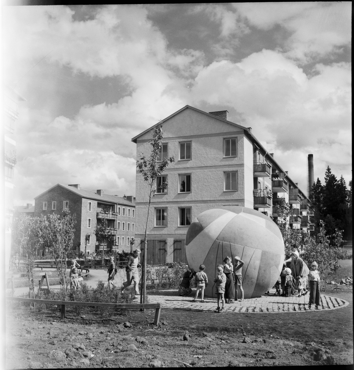 Egon Möller-Nielsen vid sin lekskulptur i Hökarängen