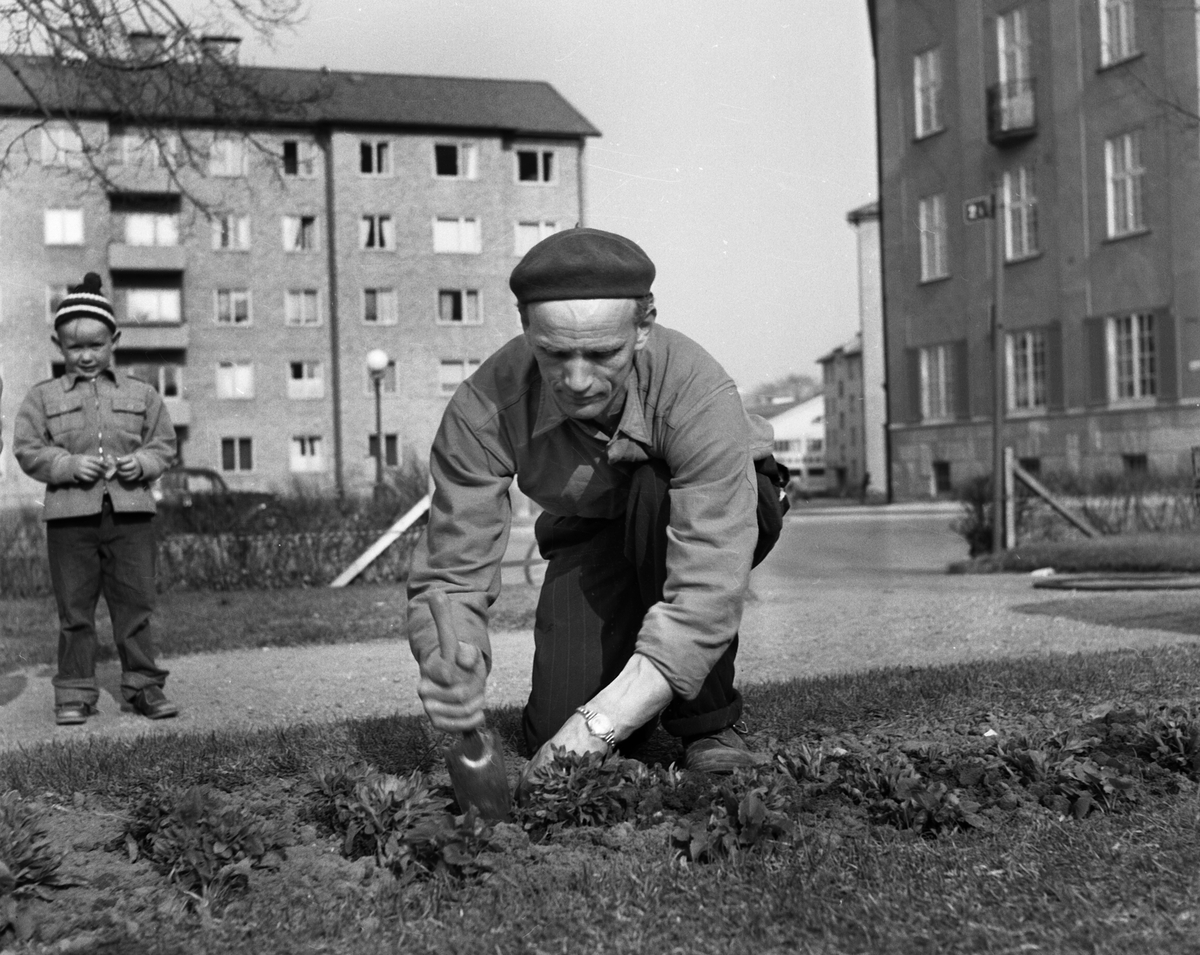 Trädgårdsarbetaren Ivar Kling planterar lökar i parken på Stureplan 1 april 1951