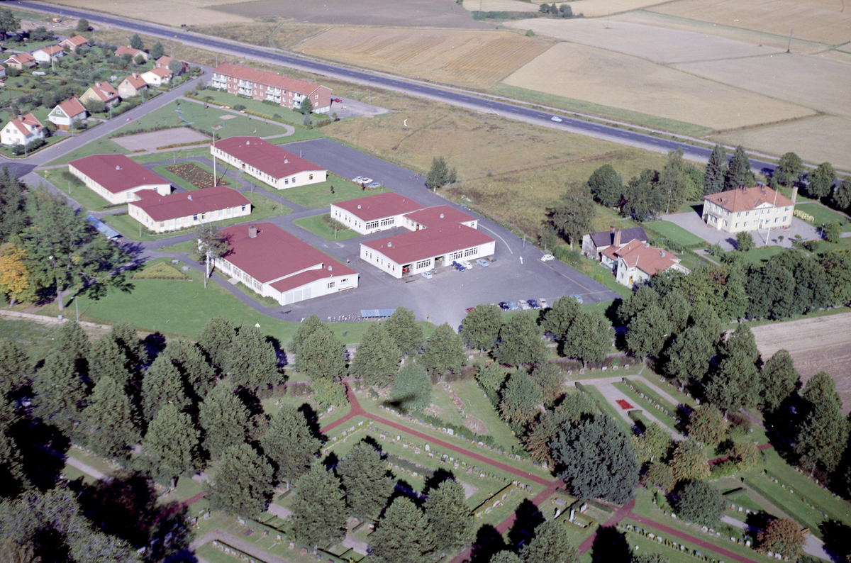 Flygfoto över Hedemora. Bachmanska skolan, delar av kyrkogården i främre kanten.