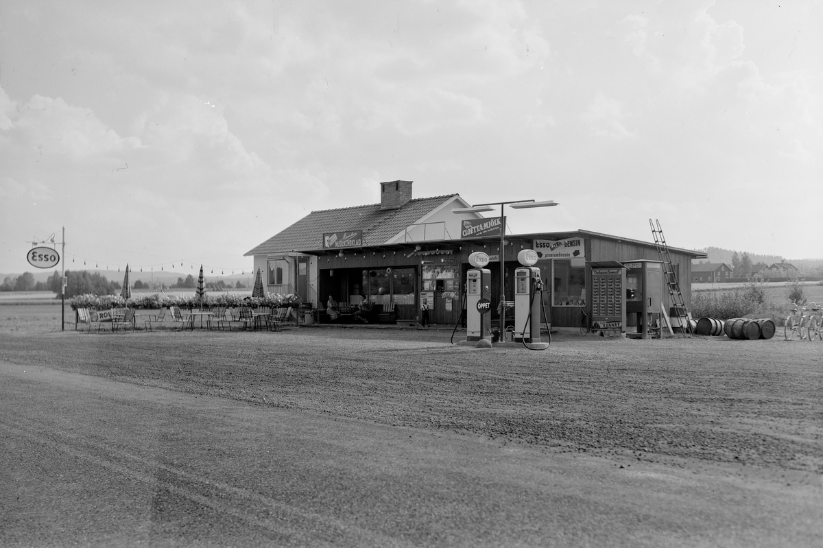 Gustafs. Gustafs, kiosk. Skyltar med text: Marabo mjölkchoklad; Esso; Cloetta mjölk.