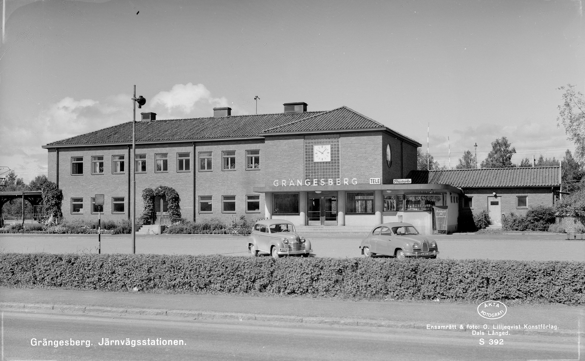 Grängesberg. Järnvägsstationen. Skyltar med text: Pressbyrån; Tele.
