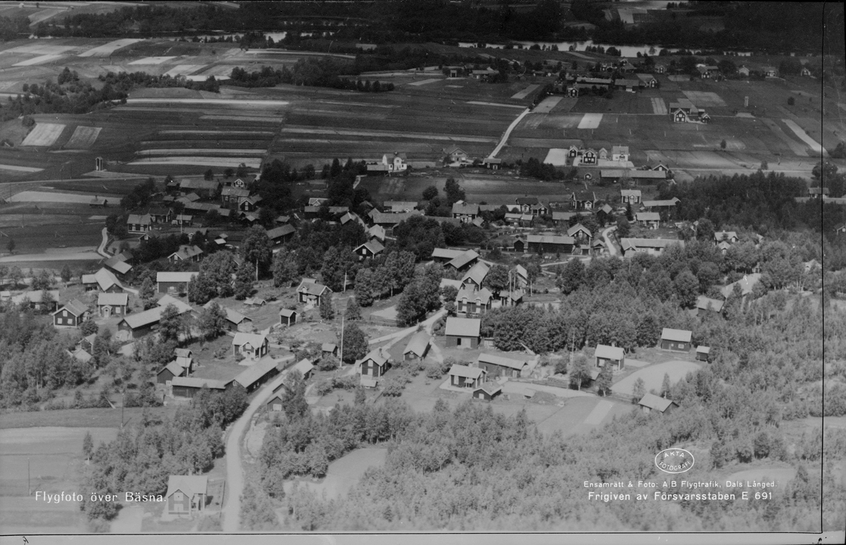 Flygfoto över Bäsna. Det finns ytterligare ett ortsnamn som hör samman med detta foto: Mon.