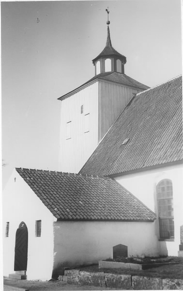 Onsala Kyrkas sydvästra vapenhus som bedöms vara uppfört under senmedeltiden. Trätornet byggdes vid 1700-talets mitt.