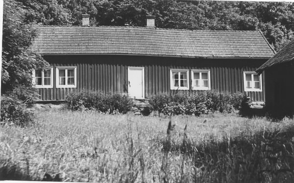 "Gamla gården i Ysby, Vallda, nu övergiven.". Vy över trädgården mot bostadshuset med stentrappa, till höger ett uthus.