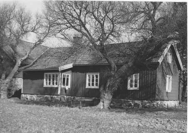 Spjälla gård, Hagryd i Släp. En trädgårdsmöbel står mellan trädet och den lilla utbyggnaden.