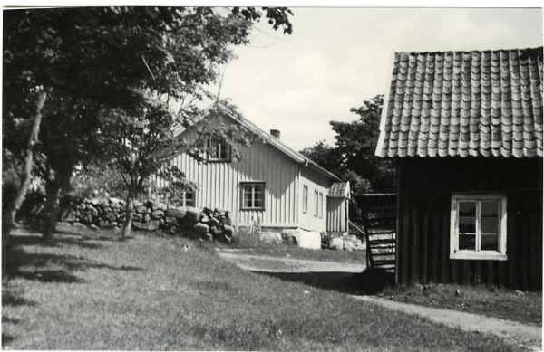 Bilden tagen midsommardagen 1944 av en gård belägen nedanför Vallda kyrka. Byggnaden närmast i bild har en utvändig trappa på gaveln till vinden.