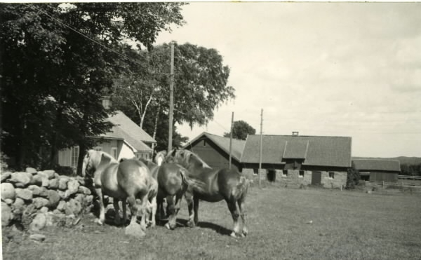 Arbetshästar vid Vallda herrgård. Bostadshuset till vänster och ekonomibyggnaderna i bakgrunden.