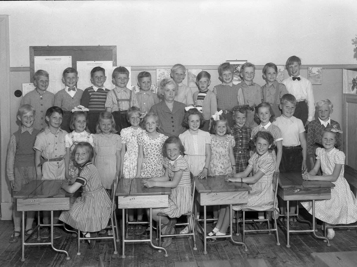 Skolfoto från Rosenfredsskolan med lärarinnan Karin Fröding. Övre raden från vänster nr 3: Hasse Johansson; nr 6 Bo-Lennart Yngvesson; nr 7 Bo Nilsson. Mittenraden från vänster nr 4: Eva Hjalmarsson och längst till höger: Kurt "Pigge" Larsson. I bänkarna från vänster nr 2: Barbro Lindskog. Känner du igen fler av eleverna så meddela oss gärna!