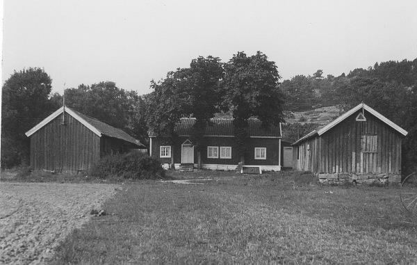Lantgård nära Guntofta med höga lövträd inpå bostadshusets fasad och ekonomibyggnader vid ömse sidor. Till vänster en plöjd åker.