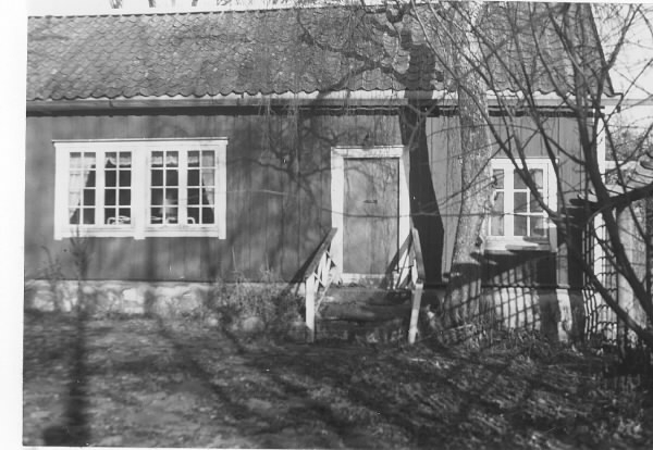 "Gård vid Budskärs hållplats." Stuga med småspröjsade fönster och träräcken vid yttertrappan.