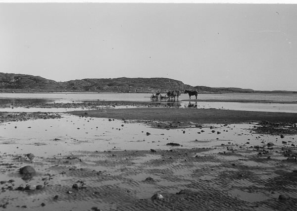 Strandvy från Jungfruviken i Släp där hästar och en kärra står ute i det grunda vattnet.