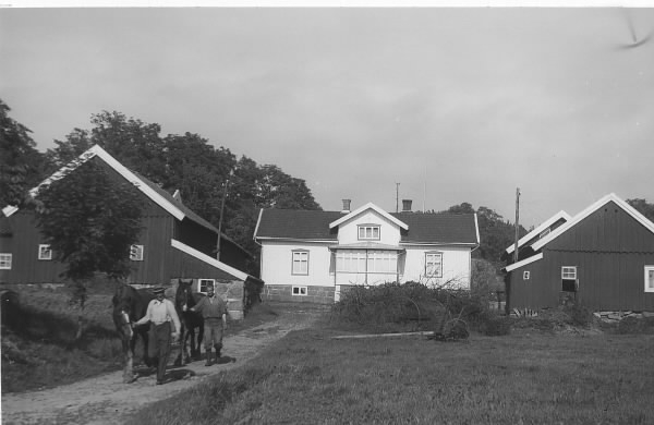 Arbetskarlar kommer gående med hästar vid Ysby gård i Vallda.