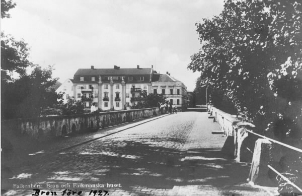 Vykort, "Falkenberg. Bron och Falkmanska huset." Påskriven text: "Bron före 1927." Vykortsförlag: Hj. Kindvalls Bokhandel, Falkenberg.