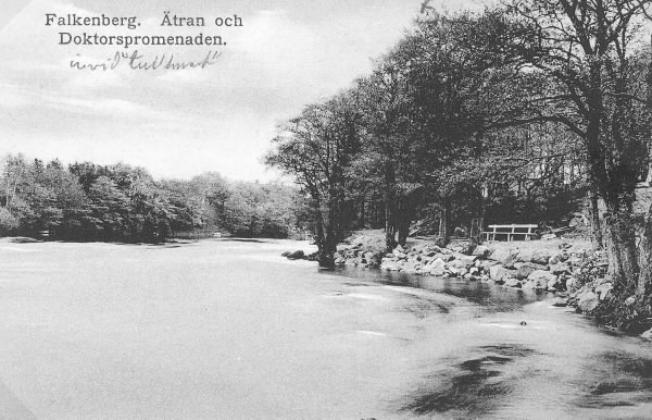 Vykort, "Falkenberg. Ätran och Doktorspromenaden." Promenadstigen är ca 2 km lång och går utmed Ätrans södra strand i Falkenberg och anlades 1862 av dåvarande stadsläkaren (åren 1856-1877) Gustaf Adam Ehrengranat. Därmed kom stigen att kallas Doktorspromenaden.