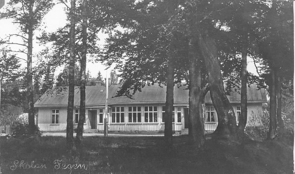 Exteriörbild, av "Skolan Fegen" som ses bakom träden i förgrunden. Fotograf och fototid okänd.