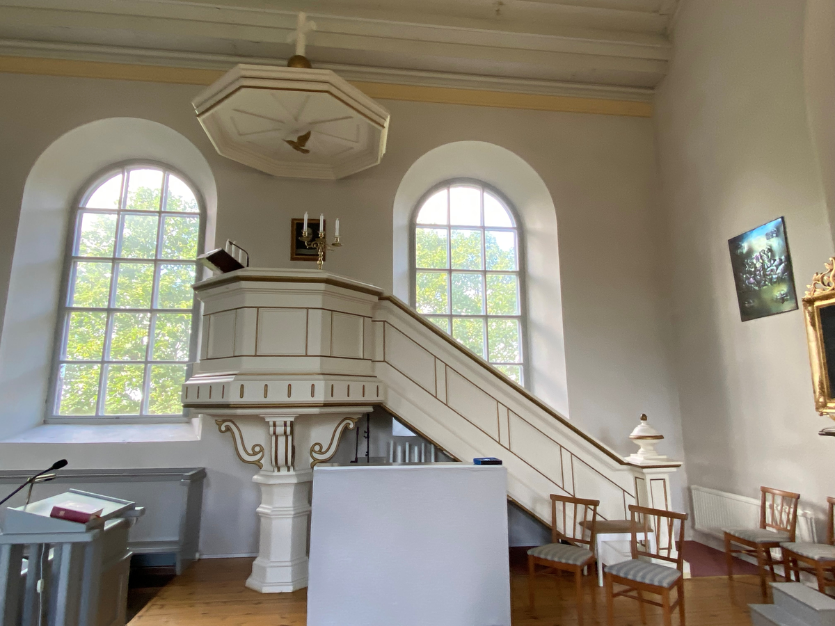 Predikstol med baldakin. Skånings-Åsaka kyrka, Skara kommun, Västra götalands län.