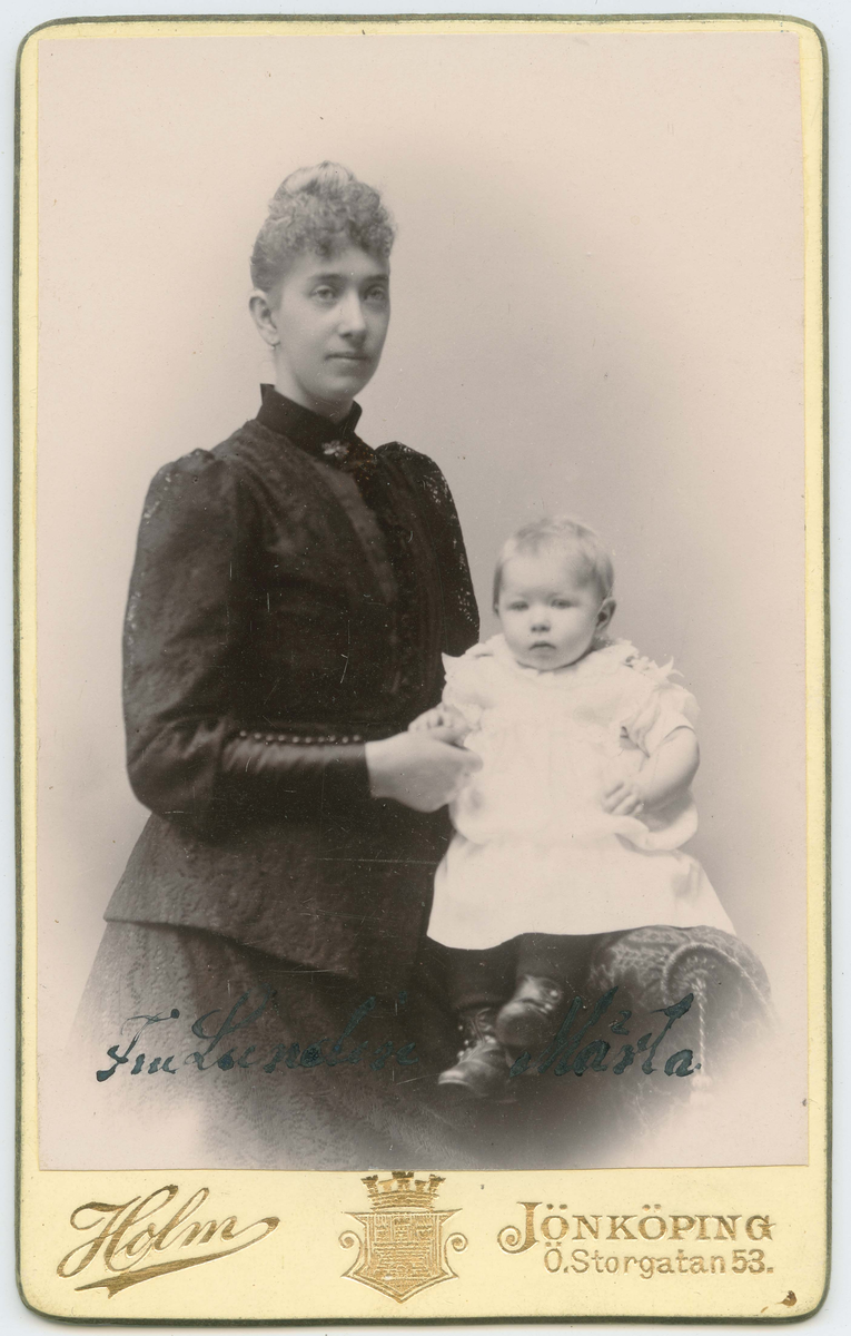 Porträtt på fru Ebba Lundin, född Almstedt, med dottern Märta som är född 30 juni år 1891. Fru Lundin är född 24 januari år 1863. Jönköping.
