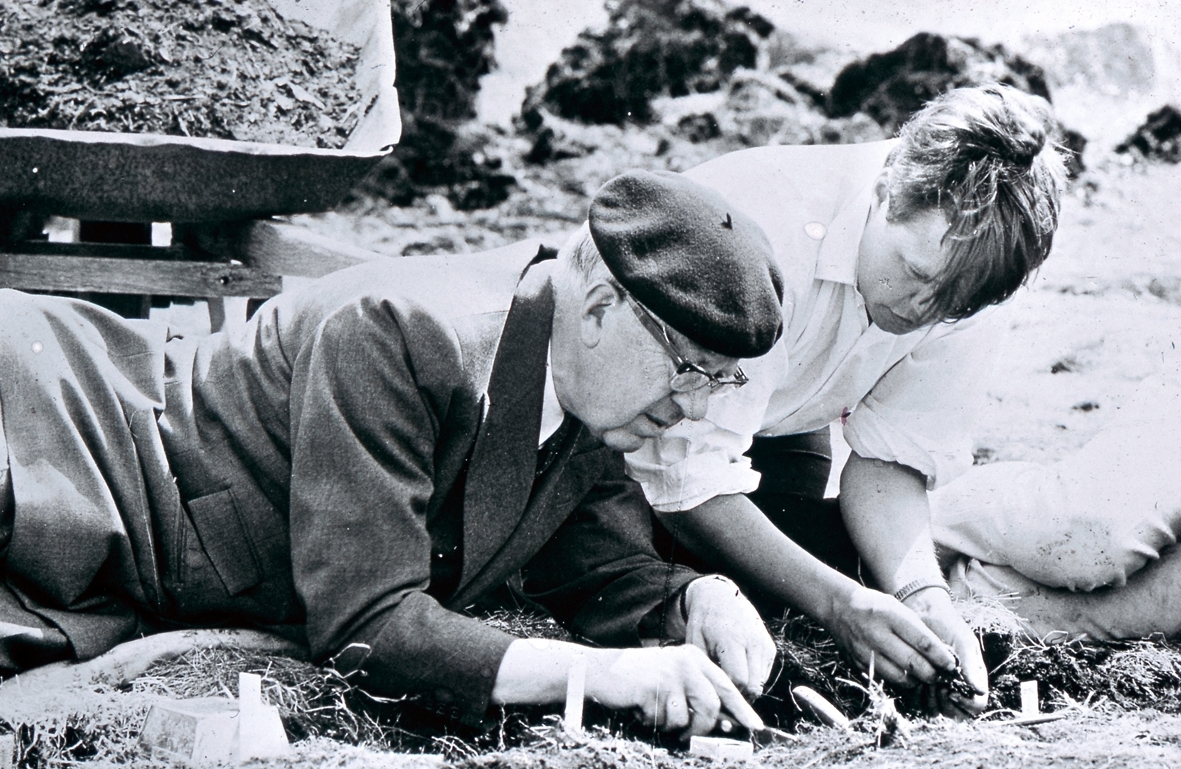 Gustaf VI Adolf och Ulf Erik Hagberg vid utgrävningarna av Skedemosse.