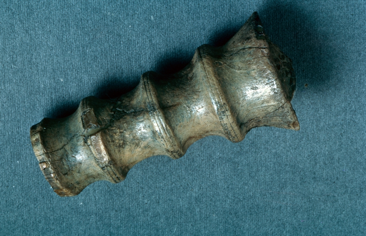 Svärdsfäste i elfenben från romersk järnålder-folkvandringstid, påträffat i Skedemosse