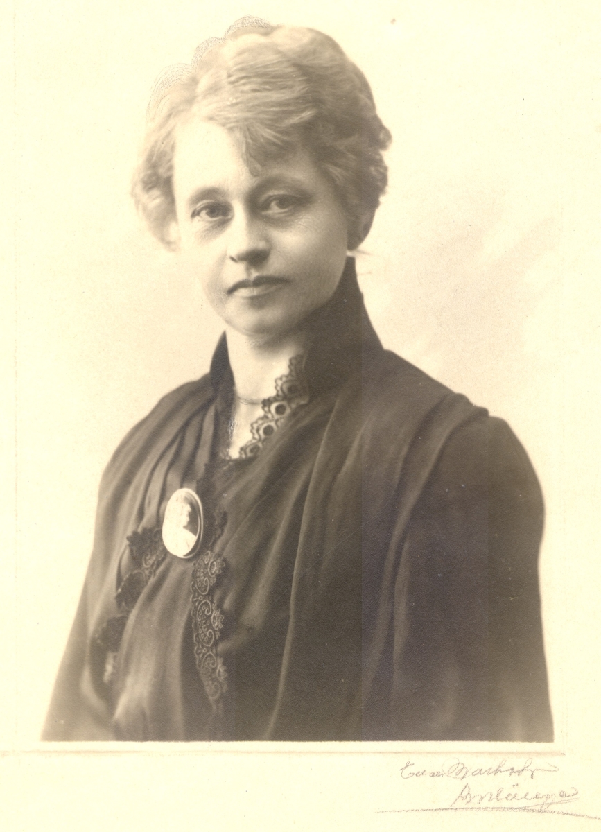 Bröstbild av Ellen Warholm i svart klänning med stor kamébrosch.