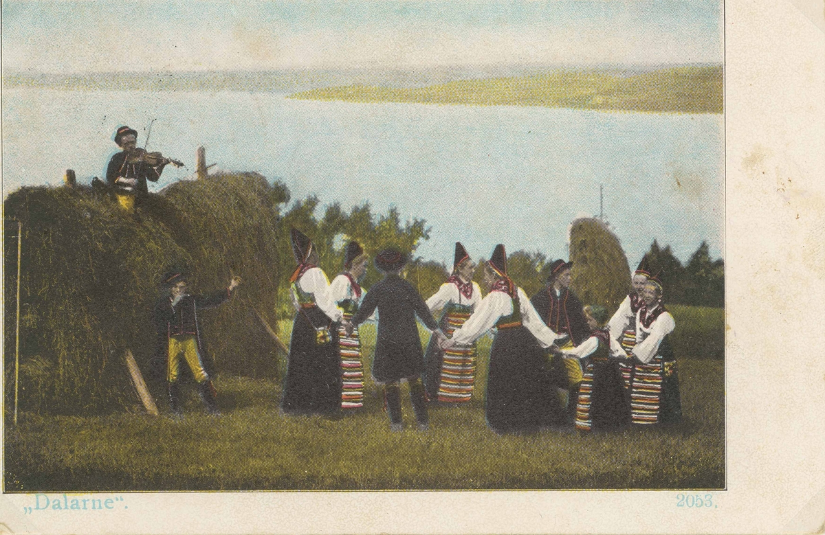 Dansande människor klädda i folkdräkter från Delsbo i Dalarna.