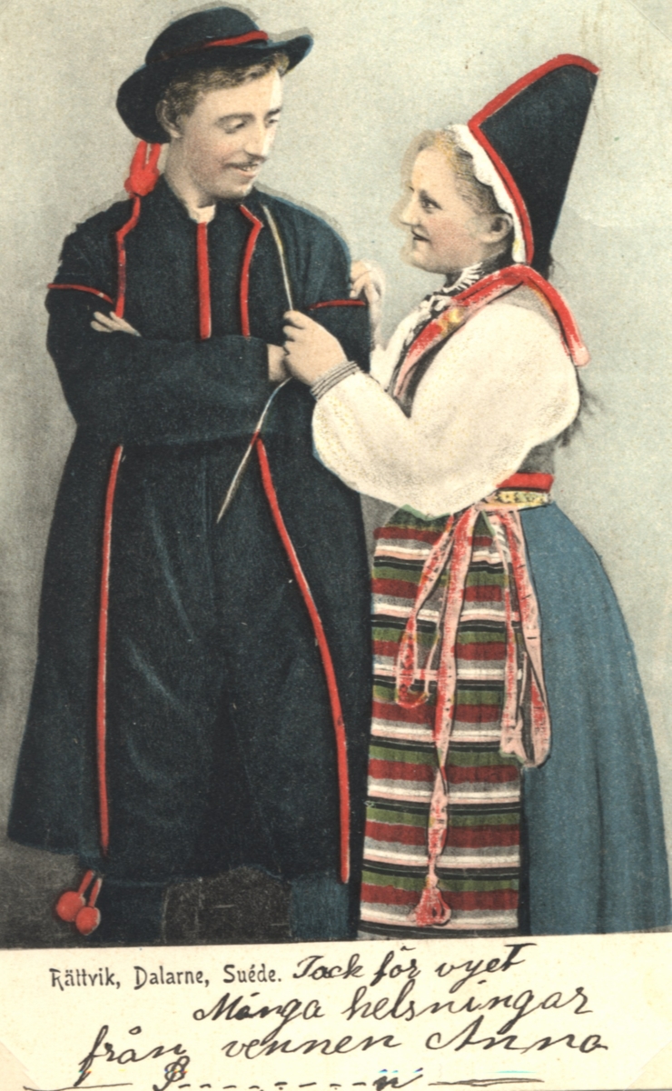 Ett vykort med en man och kvinna i folkdräkter från Rättvik.