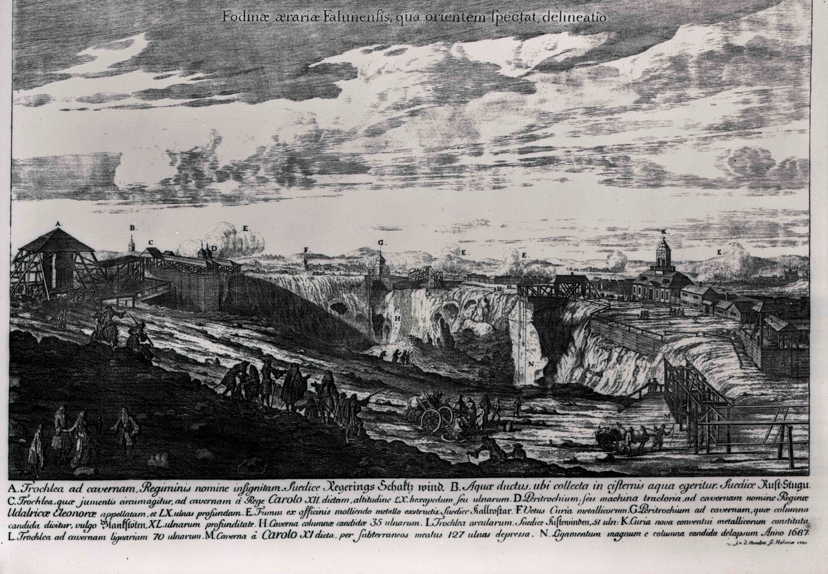 Koppar har brutits i Kopparberget minst sedan 1200-talet. Under 1600-talet var Falu gruva Sveriges största arbetsplats och en hörnpelare i stormaktsbygget. Fram till 1687 bedrevs brytningen mestadels i dagbrott. Man började dock spränga på 1620-talet. Till en början skedde detta planlöst och det anlades gruvgångar in under dagbrotten. Midsommarhelgen 1687 störtade dagbrotten samman, ner i gruvgångarna. Än idag är gropen efter detta 500 meter bred och ungefär 100 meter djup. Då alla arbetare hade ledigt för helgen krävdes inga dödsoffer.