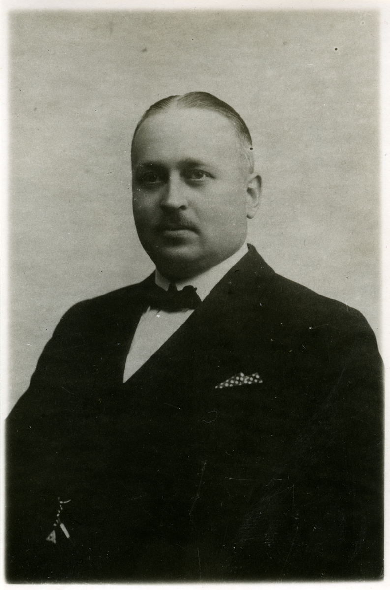 Porträtt på Anton Edgren i kostym och fluga. Fabrikör och ägare av Chokladfabriken i Kalmar, född 1882, död 1944. Ägde sedan 1920 villan Monte Cavallo, Biskopsgatan 5, Kalmar.
