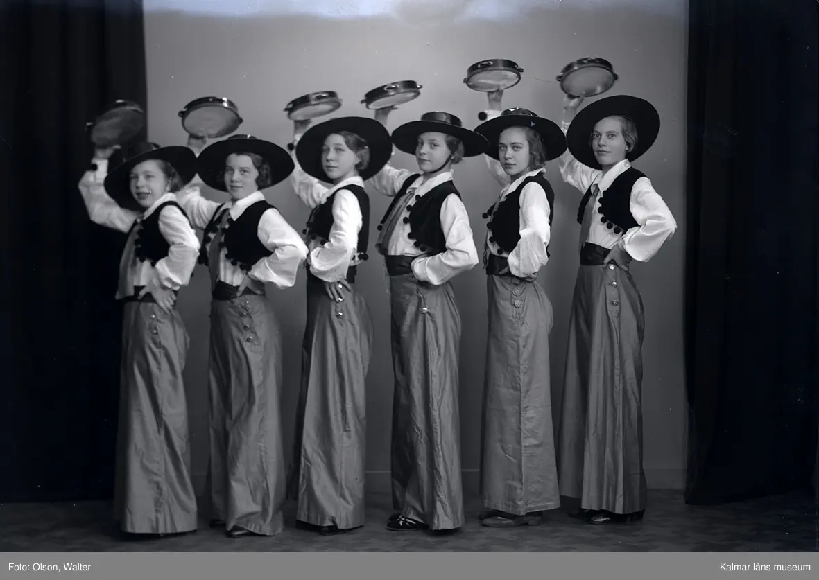 Beställare Elisabeth Selander. S. Vallgatan 15. Kvinnor i scenkläder bestående av vida byxor med hög midja, vit skjorta, kort väst och vidbrättad svart hatt. Ur Walter Olsons negativsamling.