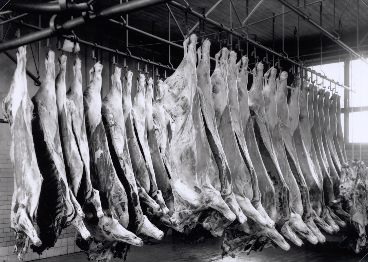 Interiör från Kontrollslakteriet i Kalmar. Griskroppar på krokar.