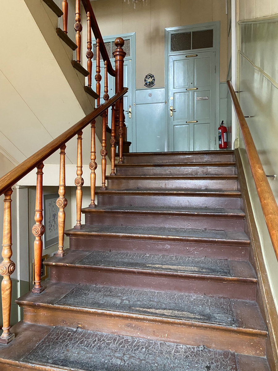 Brf Sockerkyrkan, trapphus, trappa, linoleummatta, svarvad pelare, spegeldörr, överljus.