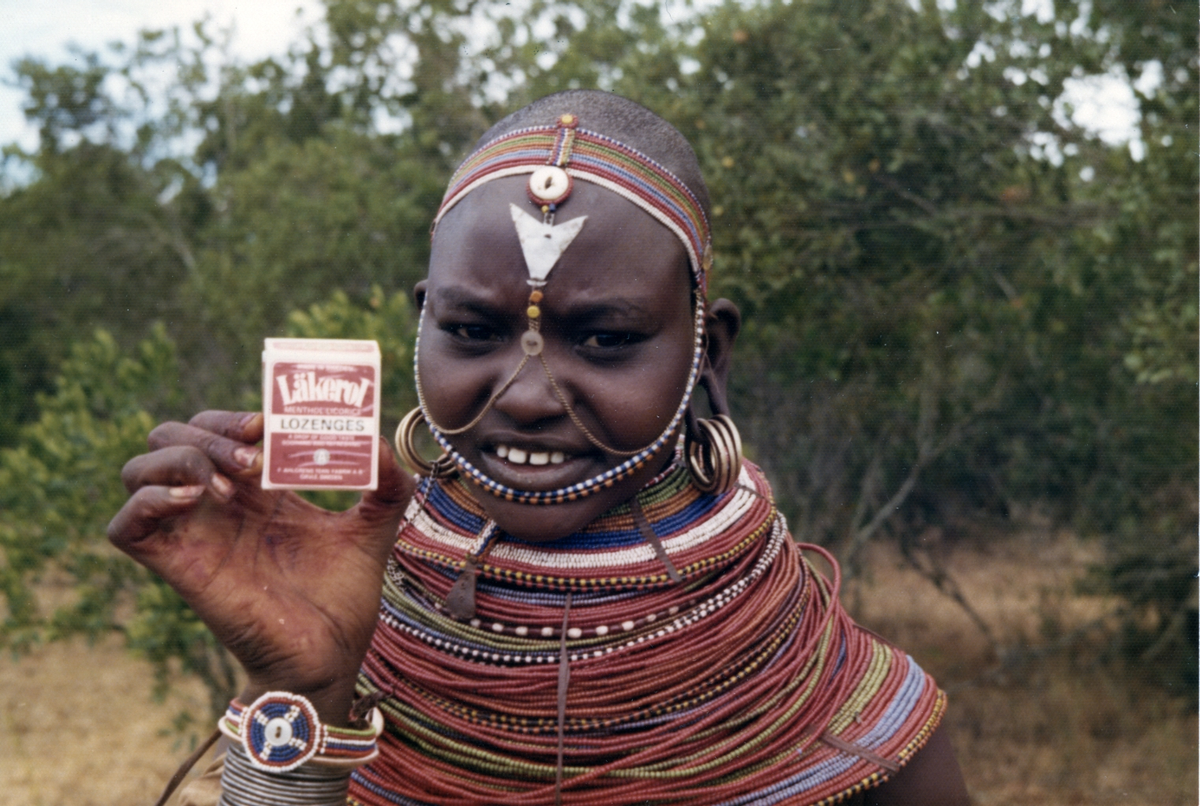 Hon är smyckad med många halsringar, stora tunga örhängen som töjt örsnibbarna. Dekorartionsband på och runt huvudet.