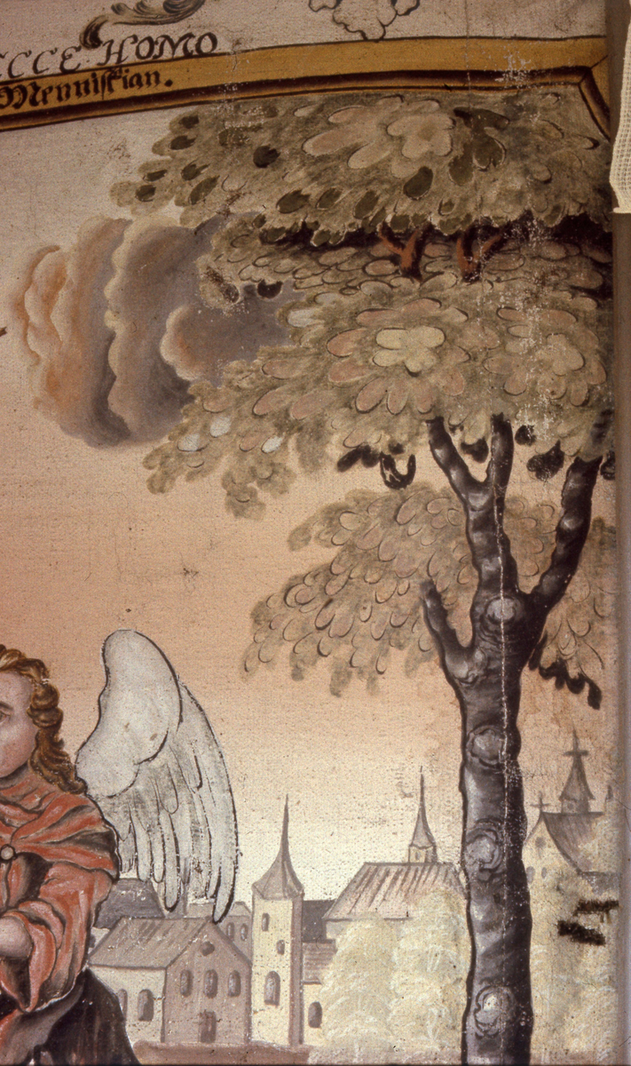 Detaljbild av väggmålning. Stad i bakgrunden. Del av ängel till vänster och ett träd till höger. Del av latinsk text, bland annat "Ecce Homo".