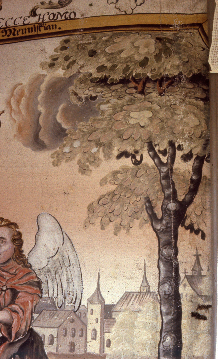Detaljbild av väggmålning. Stad i bakgrunden. Del av ängel till vänster och ett träd till höger. Del av latinsk text, bland annat "Ecce Homo".