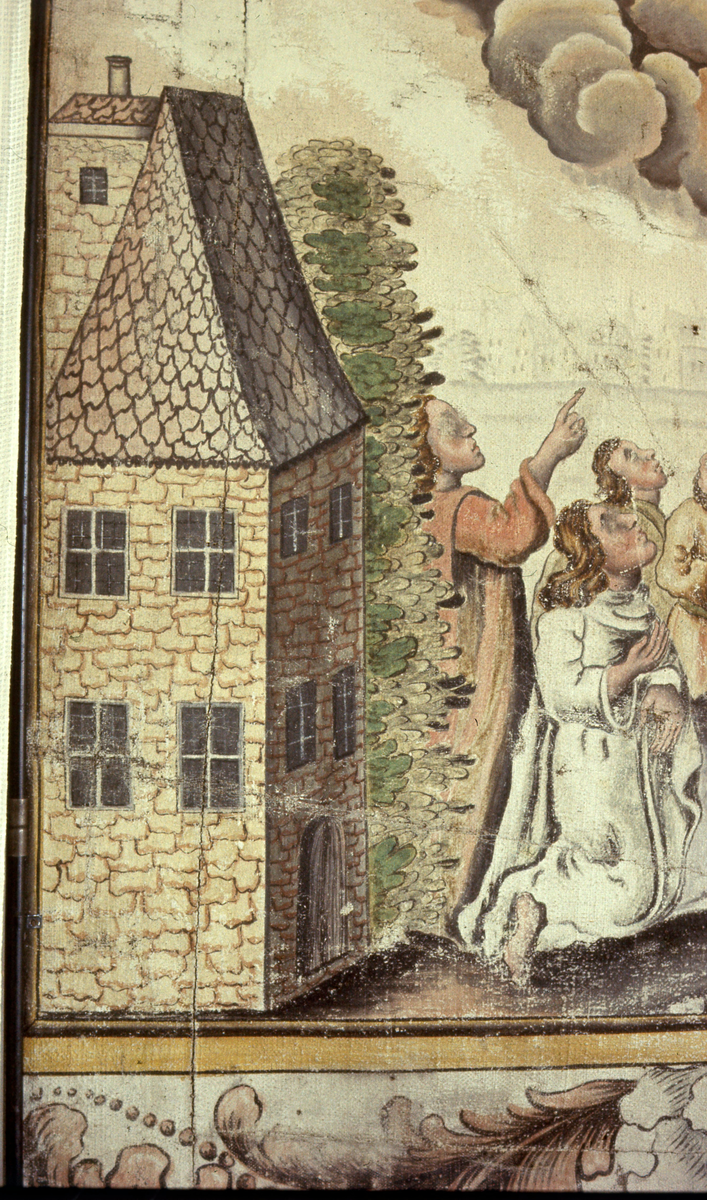 Del av väggmålning. Bibliskt motiv. Byggnad och människor i bild.